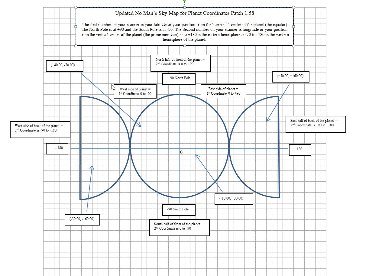 Didn’t do me any good. The first coord goes from -90 to 0 +90. Second coord goes from -180 to 0 to +180. When I go to (+90, +0) and turn all the way around, I don’t see N in the HUD - only S (and only in one direction). Doesn’t that mean I’m at the North Pole? But Discoveries still shows me at the bottom of the planet.