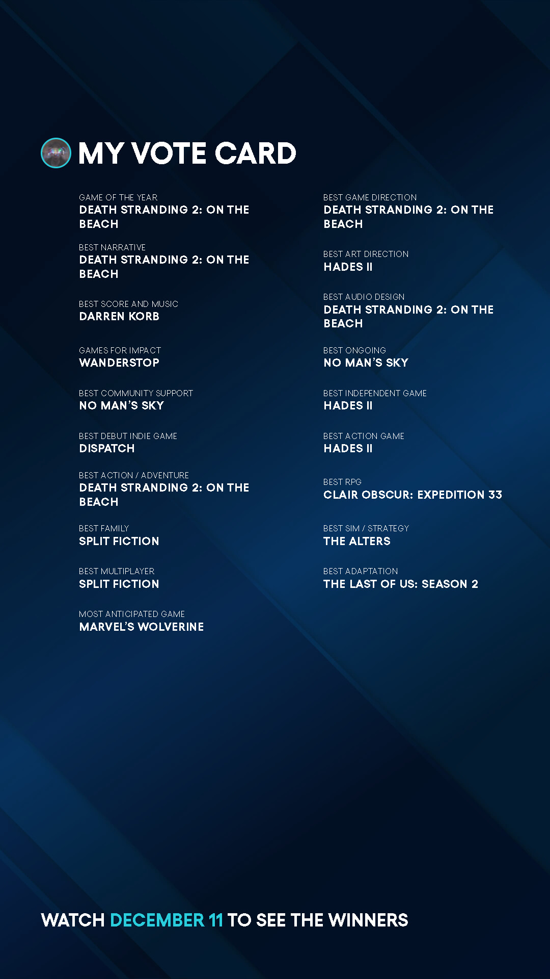 Having not played Clair Obscur I couldn’t vote for it, however in best RPG I gave it that award because I do plan to play it, watched a friend play a chunk, and the hype of a good JRPG is very true. Even though I have played Outer Worlds 2 I had to give it to Clair Obscur (cos I want the industry to remember JRPGs can be profitable/critically acclaimed